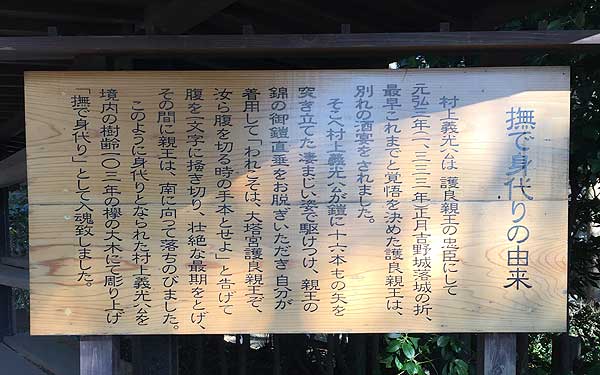後醍醐天皇の王子である護良(もりなが)親王を祭神として、明治天皇が建立しました。